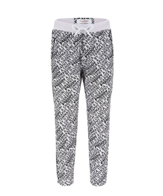 コレクション全体のグラフィックテクスチャーが脚全体にプリントされ、両側にロゴが付いたジャカードバンドと背面にラベルが貼られています。