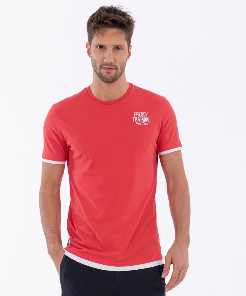 August 2, 2020 半袖Tシャツ 半袖Tシャツ ¥5,500(税込) ライトジャージー製レギュラーフィットの半袖クルーネックTシャツ。 裾と袖にカラーTシャツの下にもう一枚白のTシャツを重ね着しているかのようにデザインされています。 Freddy Training Prof Deptのレタリングが付いたグラフィックは、肩には刺繍で、下部のラベルにもプリントされています。 綿100% R103 レッド V108 グリーン Y15 イエロー B94 ネイビー
